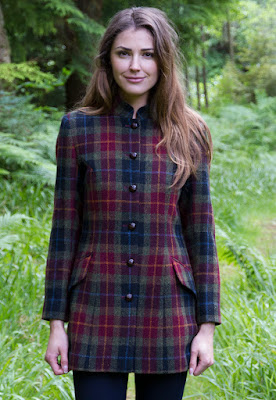 The Joanna Coat is available in a striking burgundy checked Harris Tweed. It is a beautifully cut elegant short Harris Tweed coat with a Nehru style velvet lined collar and side splits at the hem.